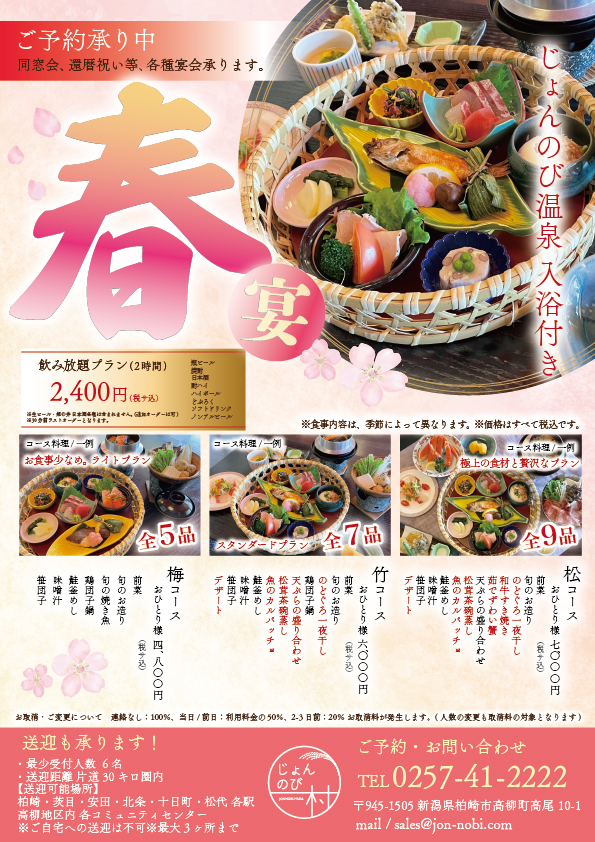 各種ご宴会 好評受付中🍻 同窓会や還暦祝い等、各種ご宴会は じょんのび村にお任せくださいませ! ご予約はお電話にて承ります! 電話番号/0257-41-2222 ご来館、お待ちしております! トップページへ戻る お知らせ一覧へ戻る
