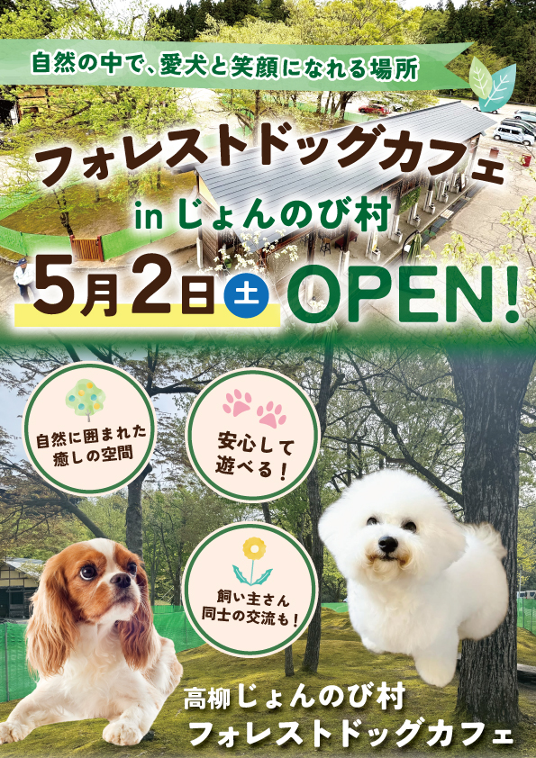 愛犬と、緑と、穏やかな時間。フォレストドッグカフェ 5.2 Sat. OPEN🐾 新緑が心地よい季節、 じょんのび村に新しい「憩いの場」が生まれます。 コンセプトは「自然の中で、愛犬と笑顔になれる場所」。 鳥のさえずりや木漏れ日を感じながら、 愛犬が楽しそうに過ごす姿を眺める贅沢。 そんな、心から「じょんのび(ゆったり)」できる時間を、 ぜひ体験しに来てください。 トップページへ戻る お知らせ一覧へ戻る