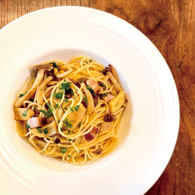【ランチA】キノコとベーコンのスパゲッティ パスタ/サラダorバケット/ドリンク付